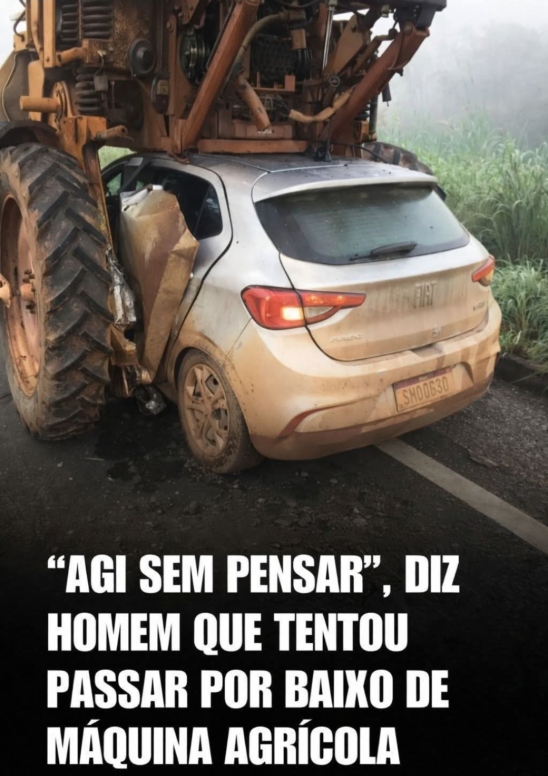 Uma tcentativa imprudente de ultrapassagem terminou em prejuízo após um motorista decidir passar por baixo de uma máquina agrícola que trafegava pela rodovia. O carro de passeio acabou ficando preso sob a estrutura do equipamento e sofreu danos expressivos na lateral e na parte superior da carroceria.