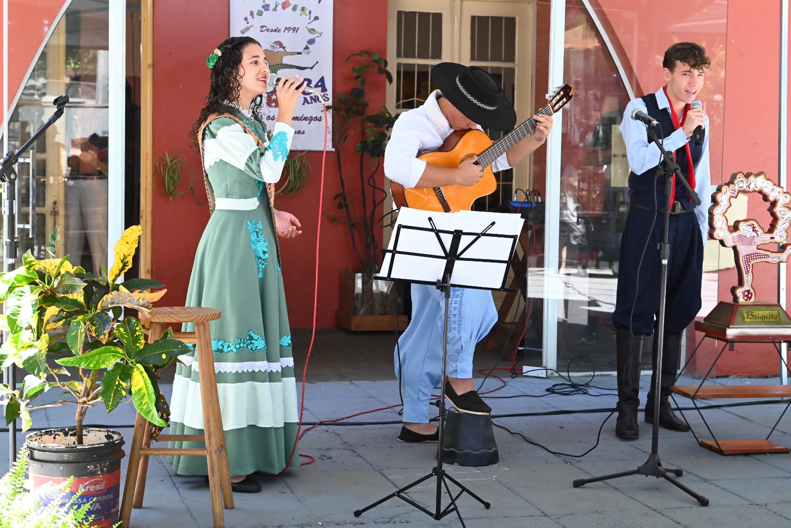 No palco cultural, Eva Sofia emocionou o público ao se apresentar com acordeon e voz, acompanhada pelos músicos Gabriel Cacenotte, no violão, e Joaquim Trintinaglia. A apresentação serena encantou a plateia que ocupou as arquibancadas. Entre os presentes estavam o escritor Renato Schorr, colunista do Jornal das Missões, o casal Moacir e Sandra Madrid, além de lideranças locais como o vereador Oswaldir Ribeiro de Souza, Valter Mildner, Antônio Braga, o professor Gilberto Corazza e ex-presidentes do Brique da Praça, como Dalmir Renato, Tânia Ledur e Nelly Silva de Oliveira.